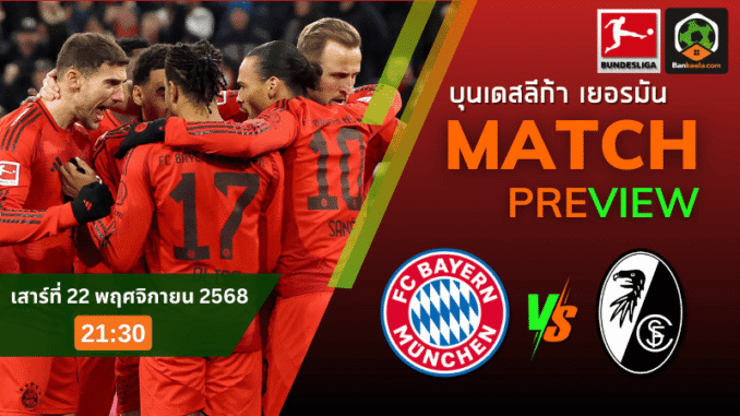บุนเดสลีกา ค่ำคืนวันเสาร์ที่ 22 พฤศจิกายน 2568 เวลา 21.30 น. สนามอลิอันซ์ อารีน่าเตรียมเดือด เมื่อ บาเยิร์น มิวนิค จ่าฝูงของลีกจัดเต็มเปิดรังรับการมาเยือนของ ไฟร์บวร์ก ทีมอันดับ 10 บนตารางคะแนน เกมระดับบิ๊กแมตช์แบบนี้ในหน้าเว็บเช็กผลและหน้า ตารางบอลวันนี้ ถูกวงเอาไว้หนา ๆ เพราะเป็นคู่ที่สายเดิมพันและคอลูกหนังจับตาดูมากที่สุดของสัปดาห์