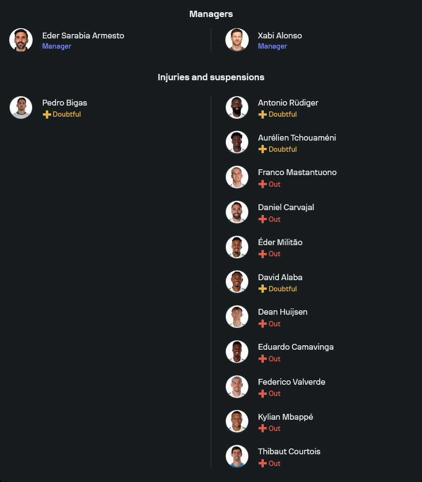 คู่มิดฟิลด์ตัวรับใช้ เอดูอาร์โด้ คามาวิงก้า ประสานงานกับ ดานี่ ฮวยเซ่น (หรือกองกลางเชิงรับสลับยืน) ส่วนสามตัวรุกหลังหน้าเป้าเป็น วินิซิอุส จูเนียร์ ทางซ้าย, อาร์ด้า กูเลอร์ ตรงกลาง และ เฟเดริโก้ วัลเวร์เด้ ทางขวา โดยมี คีเลียน เอ็มบัปเป้ เป็นหัวหอกตัวเป้า ขณะที่ตัวเจ็บมีชื่อใหญ่ๆ ทั้ง เอแดร์ มิลิเตา, ดานี่ การ์บาฆาล, เดวิด อลาบา รวมถึง ฟรังโก้ มาสตันตูโอโน่ ทำให้แนวรับต้องสลับตำแหน่งกันเยอะพอสมควร แม้ขุมกำลังรุกยังแน่นแต่โซนหลังถือว่าน่าห่วงอยู่