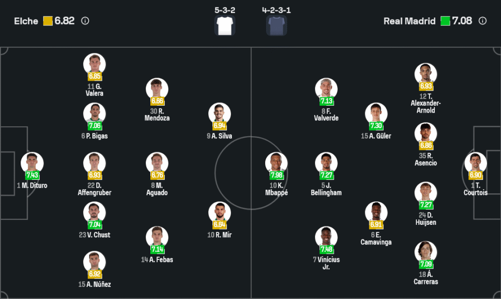 จากไลน์อัพในภาพของ Sofascore เอลเช่จัดระบบ 5-3-2 เล่นเกมรับแน่นรอสวนกลับ ผู้รักษาประตูใช้ มาติอัส ดิตูโร่ ที่เซฟสำคัญๆ ให้ทีมมาหลายนัด แนวรับสามคนยืนเป็น เปโดร บีกาส, ดาเนียล อัฟเฟิร์นกรูเบอร์ และ บิกตอร์ ชุสต์ ขนาบข้างด้วยวิงแบ็กอย่าง เคร์มาน บาเลร่า ทางซ้าย และ โรดริโก้ เมนโดซ่า ทางขวา