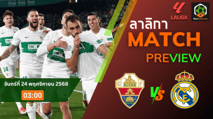 ลาลีกา คืนวันจันทร์ที่ 24 พฤศจิกายน 2568 เวลา 03.00 น. ตามโปรแกรมใน ตารางบอลวันนี้ แฟนบอลสายกระทิงดุต้องไม่พลาด ศึกใหญ่ที่เอสตาดิโอ มานูเอล มาร์ติเนซ บาเลโร่ เมื่อเจ้าถิ่น เอลเช่ ทีมกลางตารางอันดับ 11 เปิดบ้านรับการมาเยือนของจ่าฝูง เรอัล มาดริด ที่กำลังไล่ล่าแต้มหนีคู่แข่งโดยตรงอย่างบาร์เซโลน่าแบบหายใจรดต้นคอ เกมนี้บ่อนเมืองนอกเปิดหน้าเสื่อให้ “ราชันชุดขาว” ต่อแรงระดับลูกครึ่งควบสอง (ประมาณ 1.5-1.75) สะท้อนว่าชื่อชั้นและศักยภาพทีมยังเหนือกว่าชัดเจน แต่เมื่อมองจากฟอร์มเหย้าที่เหนียวแน่นของเอลเช่ บอกเลยว่าราคานี้ไม่ได้เดินง่ายๆ แน่นอน