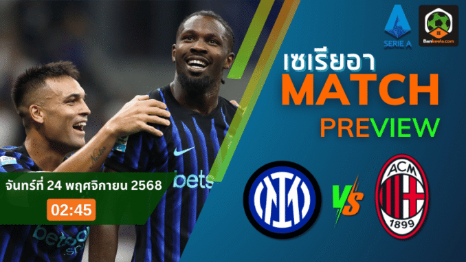 เซเรียอา คืนวันจันทร์ที่ 24 พฤศจิกายน 2568 เวลา 02.45 น. ตามโปรแกรมในหน้า ตารางบอลวันนี้ จูเซ็ปเป้ เมอัซซ่า จะลุกเป็นไฟเมื่อเจ้าบ้านอย่าง อินเตอร์ มิลาน เปิดรังรับคู่ปรับร่วมเมือง เอซี มิลาน ศึกแห่งศักดิ์ศรีที่ไม่ใช่แค่สามแต้ม แต่คือหน้าเกียรติของทั้งสองสีเสื้อบนถนนสายเดียวกัน แรงเชียร์ในสังเวียนซาน ซิโร่ฝั่งงูใหญ่จะถาโถมตั้งแต่นาทีแรก ขณะที่แฟนปีศาจแดงดำก็พร้อมส่งเสียงกดดันให้ทีมรักกลับออกมาพร้อมคะแนน