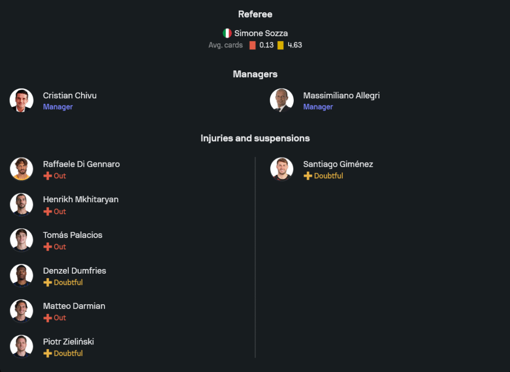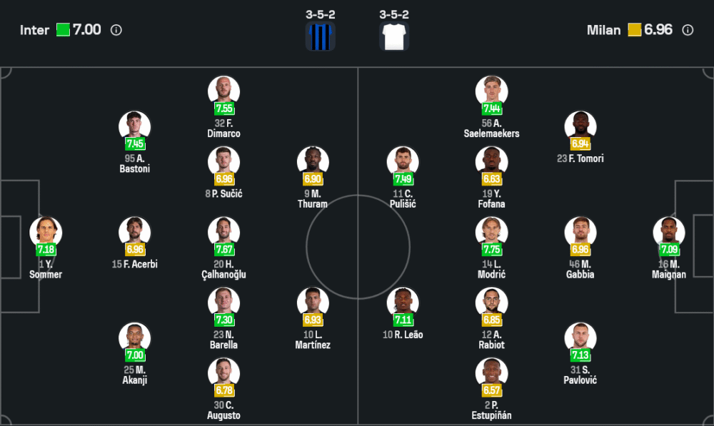 จากข้อมูลไลน์อัพของ Sofascore เกมนี้อินเตอร์ยังยึดระบบ 3-5-2 ของกุนซือหนุ่ม คริสเตียน คิวู ยานน์ ซอมเมอร์ เฝ้าเสา สามเซ็นเตอร์ใช้ มานูเอล อาคานยี่, ฟรานเชสโก้ อาแชร์บี และ อเลสซานโดร บาสโตนี่ วิงแบ็กซ้ายขวาเป็น เฟเดริโก้ ดิมาร์โก้ กับ คาร์ลอส ออกุสโต้ แดนกลางประกอบด้วย เปตาร์ ซูชิช, ฮาคาน ชัลฮาโนลู และ นิโคโล่ บาเรลล่า ส่วนคู่หน้าจัดหนัก มาร์คุส ตูราม ประสาน เลาตาโร่ มาร์ติเนซ