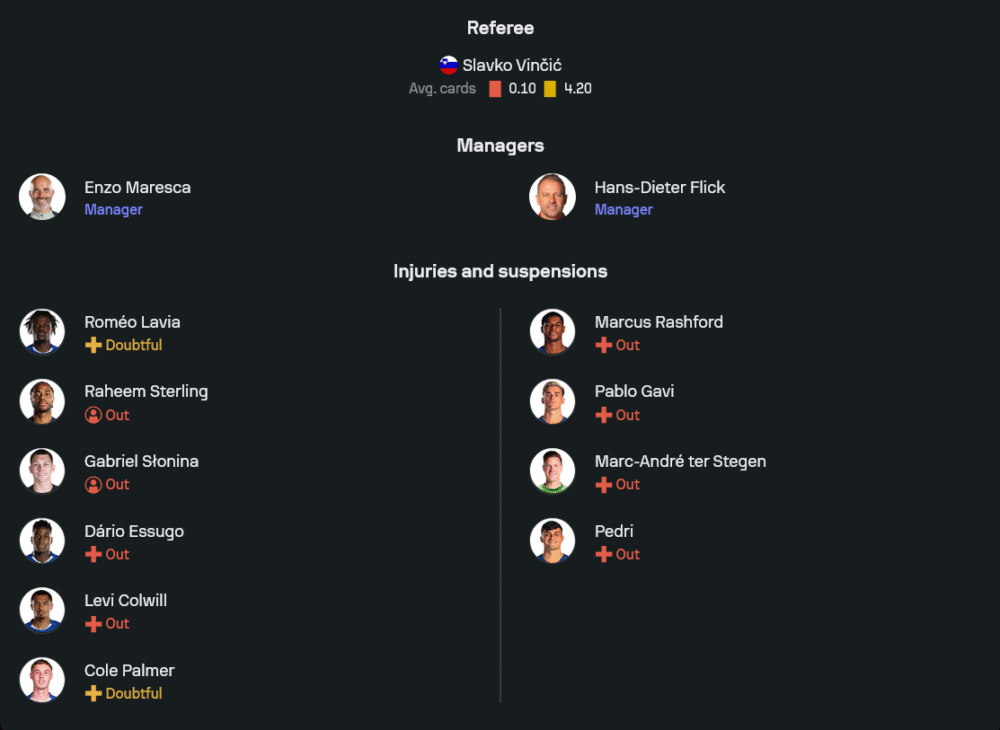 อย่างไรก็ตาม มาเรสก้ายังต้องลุ้นความฟิตของ โรเมโอ ลาเวีย และ โคล พัลเมอร์ ขณะที่ ราฮีม สเตอร์ลิ่ง, กาเบรียล สโลนิน่า, ดาริโอ เอสซูโก้ และ เลวี โคลวิลล์ ยังอยู่ในกลุ่มบาดเจ็บต่อเนื่อง ทำให้ตัวเลือกหมุนเวียนมีจำกัดพอสมควร
