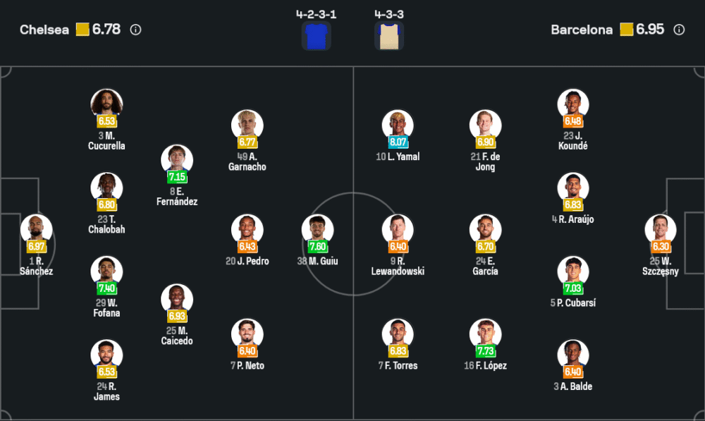 บาร์เซโลน่ายังได้เปรียบเรื่องเทคนิคและชั้นเชิงนักเตะระดับโลก โดยเฉพาะการขึ้นเกมจากแดนกลางที่มีเดอ ยอง คอยคุมจังหวะ เปิดพื้นที่ให้ยามาลกับตอร์เรสลากตัดเข้ายิงหรือป้อนบอลให้เลวานดอฟสกี้ในกรอบเขตโทษ แต่ปัญหาสำคัญคือเกมรับที่ยังไม่น่าไว้ใจ เมื่อเซนเตอร์อย่างอาเราโฆ่และการ์เซียต้องรับมือกับลูกสวนกลับเร็วของเชลซีที่อันตรายสุดๆ