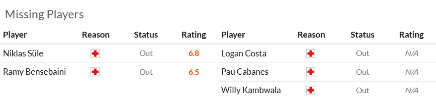 อย่างไรก็ตาม เจ้าถิ่นจะไม่มีนิคลาส ซือเลอ กับรามี่ เบนเซไบนี่ สองแนวรับตัวใหญ่ที่เดี้ยงยาว ทำให้การป้องกันลูกกลางอากาศอาจไม่แน่นเท่าที่ควร หากแผงหลังสามคนที่เหลือไม่ละเอียดพออาจโดนลูกครอสจากริมเส้นของทีมเยือนได้น่ากังวล