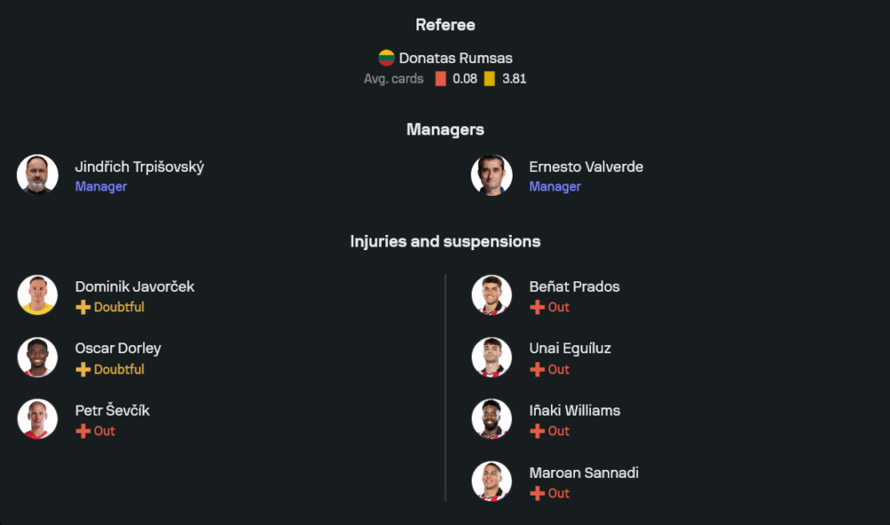 เจ้าถิ่นกลับมามีขุมกำลังแทบจะฟูลทีม ปัญหาตอนนี้เหลือแค่สองตัวที่ยังต้องเช็กฟิตคือ โดมินิก ยาวอร์เซก กับ ออสการ์ ดอร์ลี่ย์ ที่มีสัญลักษณ์ “doubtful” จากภาพไลน์อัพ ส่วน เปตร์ เชฟชิค ต้องพักยาวต่อไป แต่กระดูกหลักชุดที่พาทีมไล่ยิงในลีกกลับมาครบ นำโดย ยาคุบ สตาเน็ก ผู้รักษาประตู, แผงหลังสามคน ซีม่า-ชาลูเป็ค-วิลเช็ค และคู่กลางอย่าง คริสตอส ซาเฟียริส กับ มิชาล ซาดิเล็ก ที่ยืนคุมจังหวะเกมรุกเกมรับได้แน่น
