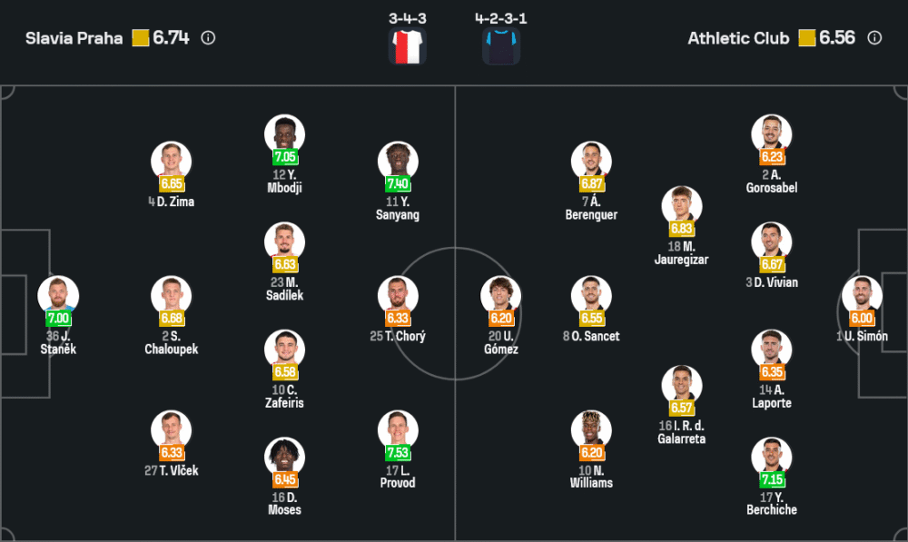 แผนการเล่นคาดว่าจะเป็น 4-2-3-1 ตามถนัด มี อูไน ซิม่อน เฝ้าเสา กองหลังสี่คนคือ อันเดร์ โกโรซาเบล ยืนแบ็กขวา ดานี่ บิเบียน จับคู่ เอเมอริก ลาปอร์กต์ ตรงกลาง และ ยูริ เบร์ชีเช ดูแลฝั่งซ้าย แดนกลางใช้ อินญีโก้ รูอีซ เด กาลาร์เรต้า คู่กับ โออูฮาน ซานเซ็ต ทำหน้าที่เบรกเกมและจ่ายบอลขึ้นหน้า สามตัวรุกใช้ อเล็กซ์ เบเรนเกร์ ลากเลื้อยทางซ้าย ราอูล การ์เซีย หรือ กาลาร์เรต้า ยืนกลางรุก แล้วให้ นิโก้ วิลเลียมส์ ขยับเข้ามาเป็นหอกตัวเป้าแทนพี่ชายที่เดี้ยงอยู่ จังหวะสปีดจัดๆ ของแข้งหมายเลข 10 นี่แหละคืออาวุธสำคัญที่แนวรับสลาเวียต้องระวัง