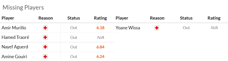 โรแบร์โต้ เด แซร์บี ยังต้องปวดหัวกับอาการบาดเจ็บของแข้งหลักหลายรายจากภาพข้อมูลล่าสุด ไม่ว่าจะเป็น อามีร์ มูริโย, ฮาเหม็ด ตราโอเร, นาเยฟ อาเกิร์ด และ อามีน กูอีรี ที่พากันเดี้ยงยาวทั้งหมด แต่ข่าวดีคือแกนหลักที่ระเบิดฟอร์มในลีกส่วนใหญ่ยังอยู่ครบ