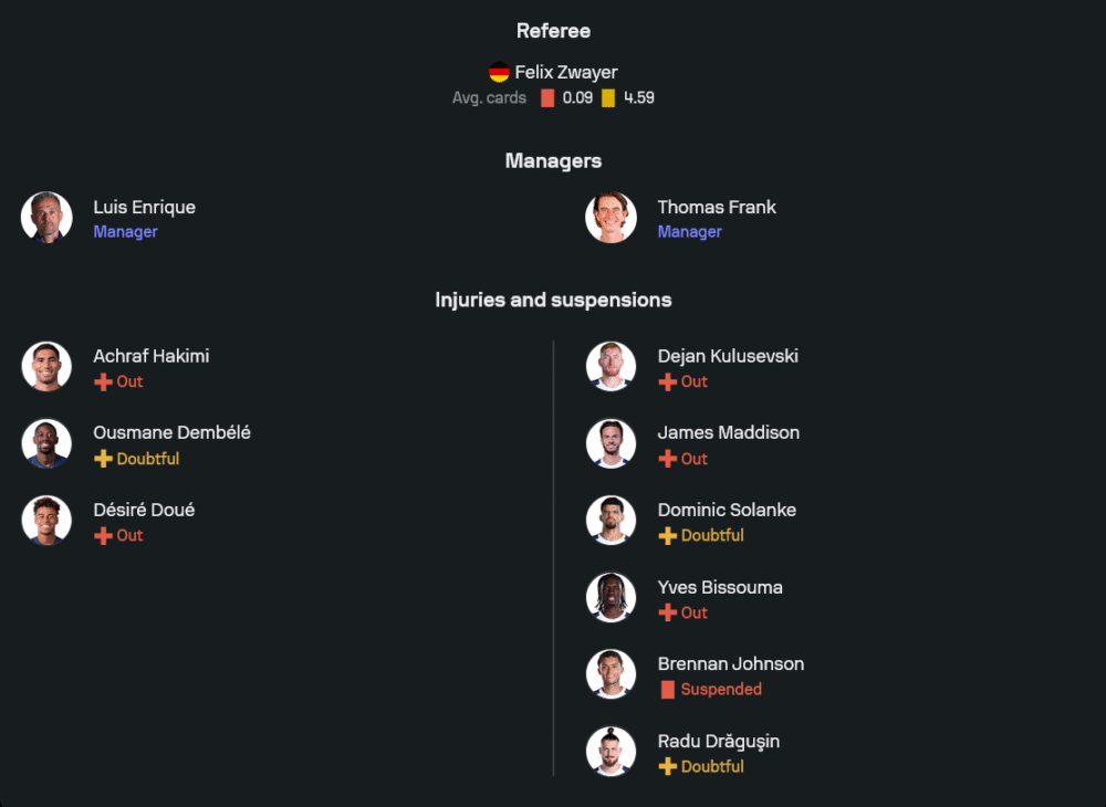 ปัญหาใหญ่ของเจ้าบ้านคือการขาดสามตัวรุกที่เจ็บอยู่ก่อนแล้ว อาคราฟ ฮาคิมี, อุสมาน เดมเบเล และ เดซิเร ดูเอ ยังไม่พร้อมลงสนาม ทำให้ตัวเลือกริมเส้นน้อยลงแต่ก็เปิดโอกาสให้ขุมกำลังใหม่โชว์ของแทน