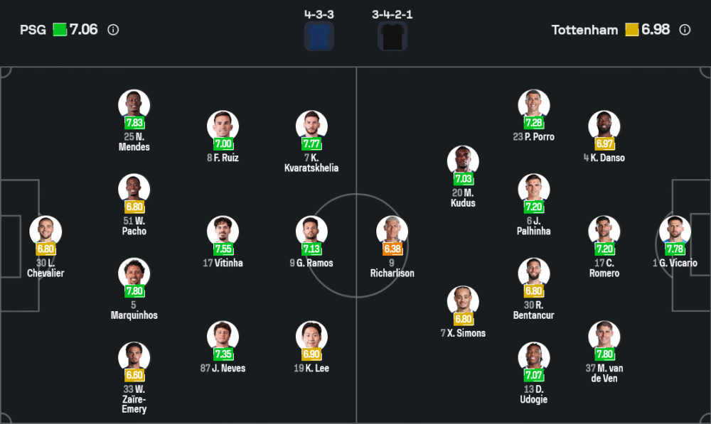 แดนกลางสามคนจัดชุดใหญ่ไล่ตั้งแต่ ฟาเบียน รุยซ์, เจา เนเวส และ อี คัง อิน ที่ถูกใช้เป็นตัวเชื่อมเกมรุกให้ทีม สามารถหมุนเวียนตำแหน่งกันได้อย่างยืดหยุ่น ขณะที่แดนหน้าสามประสานเป็น ควิชา ควารัตสเคเลีย ยืนฝั่งซ้าย วิตินญ่า หรือ วิตริญญ่า ดันสูงขึ้นไปช่วยทำเกมริมเส้น และศูนย์หน้าตัวเป้าอย่าง กอนชาโล รามอส คอยจบสกอร์ในกรอบเขตโทษ