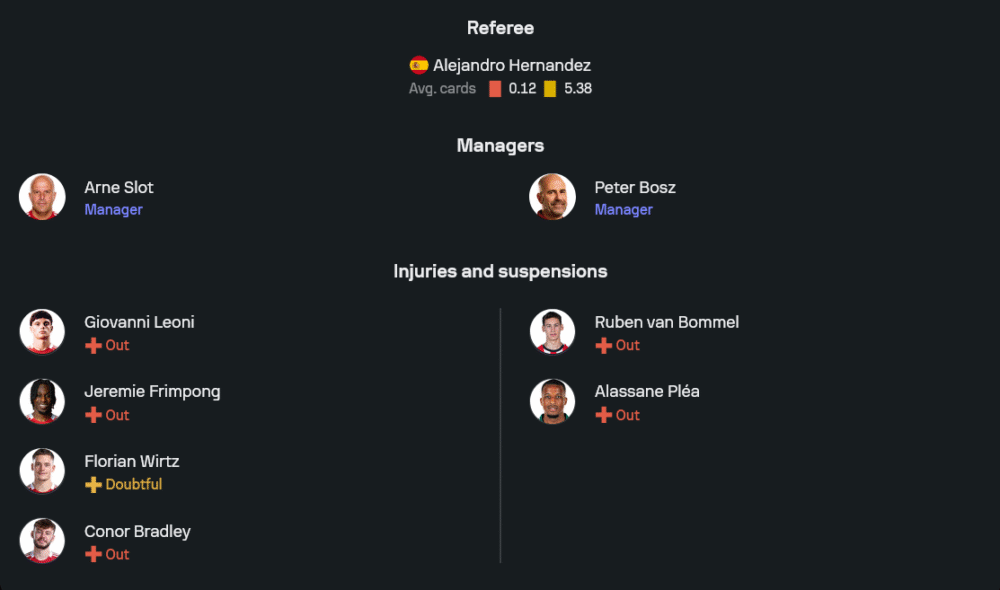 ลูกทีมของอาร์เน่ สล็อต เจอปัญหาขุมกำลังพอสมควร เมื่อรายชื่อเดี้ยงยาวตั้งแต่ ฟลอเรียน เวียร์ทซ์, คอเนอร์ แบร็ดลี่ย์, เจเรมี่ ฟริมปง, โจวานนี่ เลโอนี่ ไปจนถึง สเตฟาน บายเซติช ทำให้ตัวเลือกในเกมรับและแดนกลางลดลง แต่แกนหลักจากแผน 4-3-3 ยังอยู่กันครบ จากภาพไลน์อัพล่าสุดเราจะเห็น อลิสซง เบ็คเกอร์ ยืนเฝ้าเสา แผงหลังใช้ โจ โกเมซ ยืนฝั่งขวา คู่เซ็นเตอร์เป็น อิบราฮิม่า โกนาเต้ จับคู่กับ เฟอร์กิล ฟาน ไดย์ค ส่วนแบ็กซ้ายเป็น แอนดรูว์ โรเบิร์ตสัน ที่พร้อมเติมเกมตลอดเวลา