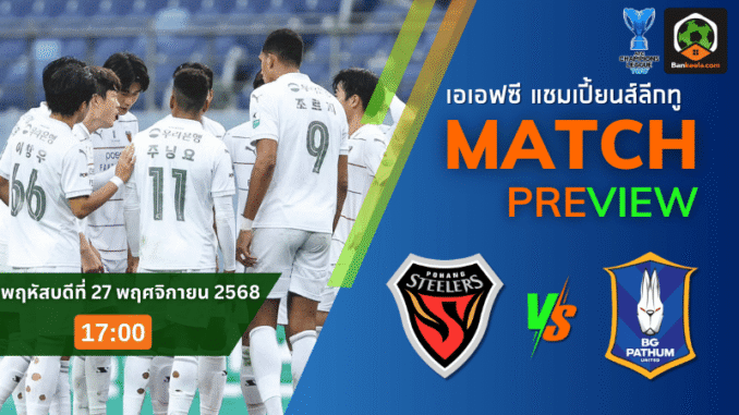 ศึก เอเอฟซี แชมเปี้ยนส์ลีก อีลิท ทู คืนวันพฤหัสบดีที่ 27 พฤศจิกายน 2568 เวลา 17.00 น. ตามเวลาไทย สนามเหย้าของโปฮังเตรียมระอุเมื่อเจ้าถิ่น โปฮัง สตีลเลอร์ ทีมดังจากเคลีก เปิดบ้านรับการมาเยือนของตัวแทนไทยลีกอย่าง บีจี ปทุม ยูไนเต็ด เกมนี้ไม่ใช่แค่เรื่องศักดิ์ศรี แต่คือหน้าเป็นหน้าตาของลีกไทยบนเวทียักษ์ระดับทวีปด้วย สายตาแฟนบอลทั้งประเทศจ้องมาที่เกาหลีใต้พร้อมกัน เปิดหน้าเว็บเช็ก ตารางบอลวันนี้ แล้วต้องวงกลมคู่นี้เอาไว้หนา ๆ