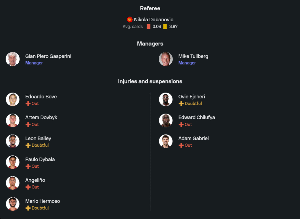 ลูกทีมของ จาน ปิเอโร่ กาสเปรินี่ กำลังมั่นใจจากการเก็บชัยในเซเรีย อาติดต่อกัน สภาพทีมเกมนี้ยังมีปัญหาผู้เล่นบาดเจ็บอยู่หลายราย ไล่ตั้งแต่ เอโดอาร์โด้ โบเว่, อาร์เต็ม ดอฟบิค, เปาโล ดีบาล่า, อันเคลินโญ และ มาริโอ เอร์โมโซ่ ที่สแตนด์บายบนม้านั่งไม่ได้ทั้งหมด รวมถึง ลีออน ไบลีย์ ที่ยังต้องเช็กสภาพร่างกายอีกครั้ง ทำให้กุนซืออิตาเลียนต้องปรับใช้ทรัพยากรที่เหลืออยู่ให้คุ้มที่สุด