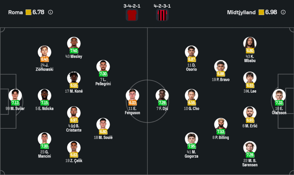 จากภาพไลน์อัปล่าสุด โรม่าใช้ระบบ 3-4-2-1 มี ไมล์ สวิลาร์ เฝ้าเสา แผงหลังสามคนประกอบด้วย จานลูก้า มันชินี่, โอบิเต เอ็นดิคก้า และ ไบรอัน คริสตานเต้ วิงแบ็กขวาเป็น เซกี้ เชลิค ฝั่งซ้ายเป็น ยาน ซิโอลคอฟสกี้ กลางสนามใช้ มานู โกเน่ ยืนคู่กับ เอลเลียต เฟอร์กูสัน ส่วนสองตัวรุกด้านหลังหอกคือ มาติอัส ซูเล่ กับ ลอเรนโซ่ เปลเลกรินี่ ที่จะคอยซัพพอร์ต เวสลี่ย์ ศูนย์หน้าตัวเป้า