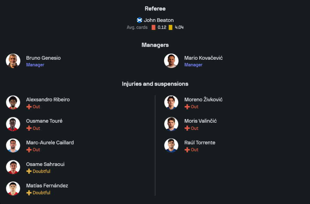 คู่กองหน้าวันนี้ถือว่าโหดใช้ได้ โอลิวิเยร์ ชิรูด์ กัปตันทีมยืนล่าตาข่ายคู่กับ อุซาม่า ซาห์ราอุย หอกตัวจี๊ดที่พาบอลทะลุแนวรับได้ดีจากภาพให้คะแนนสูงถึงระดับ 7 ขึ้นไป แม้ทีมจะมีรายชื่อเดี้ยงยาวอย่าง อเล็กซานโดร ริเบย์โร่, อุสมาน ตูเร่ และผู้รักษาประตูสำรอง มาร์ก-ออเรล กายญาร์ รวมถึง ซาห์ราอุย กับ มาติอัส แฟร์นานเดซ ที่ยังต้องเช็กฟิต แต่ตัวหลักที่ได้ลงถือว่าพร้อมลุยเต็มสูบ