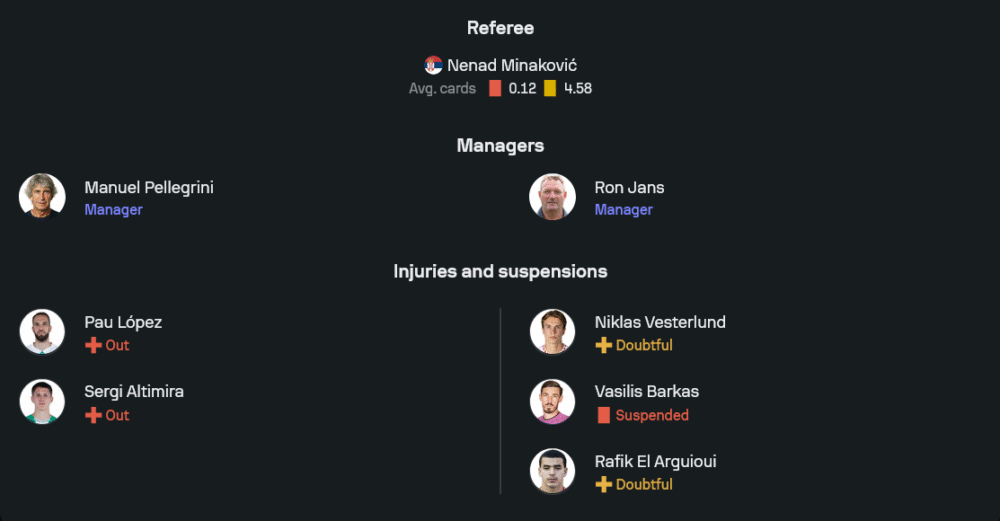 ลูกทีมของมานูเอล เปเญกรินี่ยังคงรักษาโครงหลักได้ค่อนข้างครบจากภาพไลน์อัปล่าสุด แม้จะขาดสองตัวสำคัญอย่างผู้รักษาประตู เปา โลเปซ และฟูลแบ็ก เซร์กี อัลติมิร่า ที่มีอาการบาดเจ็บ แต่เบติสยังมีขุมกำลังพร้อมทดแทน