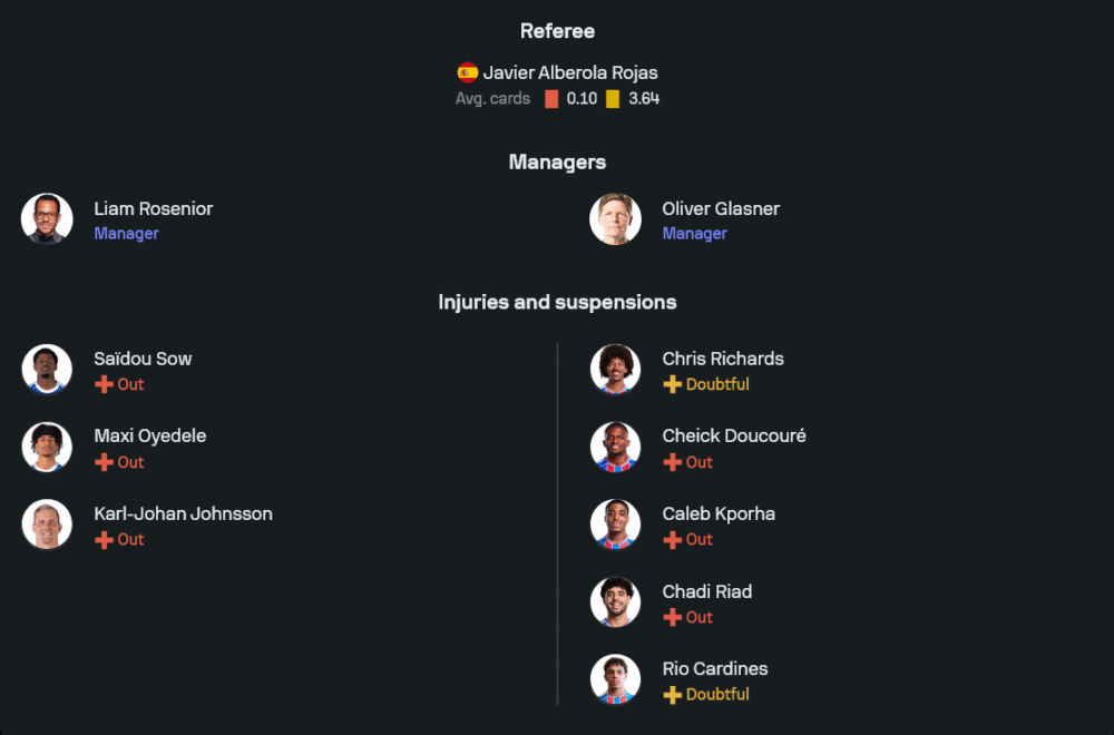 ฝั่งผู้มาเยือนภายใต้การกุมบังเหียนของโอลิเวอร์ กลาสเนอร์ กำลังมั่นใจสุดขีด ขุมกำลังอาจไม่เต็มร้อยเพราะ ชี๊ค ดูกูเร่, คาเล็บ คปอรา และ ชาดี้ ริอัด ยังต้องพัก รวมถึง คริส ริชาร์ดส์ กับ ริโอ คาร์ดีเนส ที่สภาพไม่สมบูรณ์ แต่โครงสร้างทีมยังแน่น ระบบที่ใช้จากภาพล่าสุดคือ 3-4-3 ที่ยืดหยุ่นเป็น 3-4-2-1 ได้ตลอด ดีน เฮนเดอร์สัน นายทวารทีมชาติอังกฤษยืนด่านสุดท้าย ข้างหน้ามีสามปราการหลังอย่าง ดาเนียล มูนญอซ, มักซ็องซ์ ลาครัวซ์ และ มาร์ก เกอี ที่เล่นลูกกลางอากาศได้แข็งแกร่ง