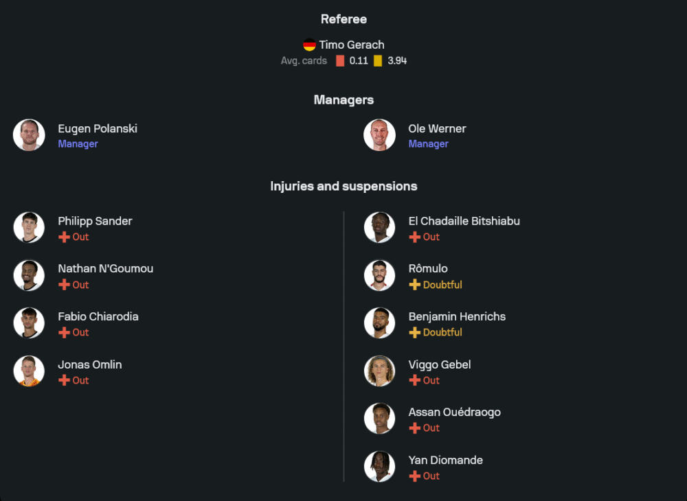 อย่างไรก็ตาม ไลป์ซิกต้องเจอปัญหาตัวเจ็บเพียบ ทั้ง เอล ชาดาย บิตชิอาบู และ เบนยามิน เฮนริคส์ ในแนวรับ รวมถึง อัสซาน อูเอดราโอโก ปีกตัวจี๊ดที่ยิงไปแล้ว 3 ประตู และ โรมูโล ศูนย์หน้าตัวหลัก ทำให้ขนาดทีมดูบางลง แต่ชุดที่ลงสนามยังคงโหดพอจะบุกมาสร้างปัญหาให้แนวรับเจ้าถิ่นแน่นอน