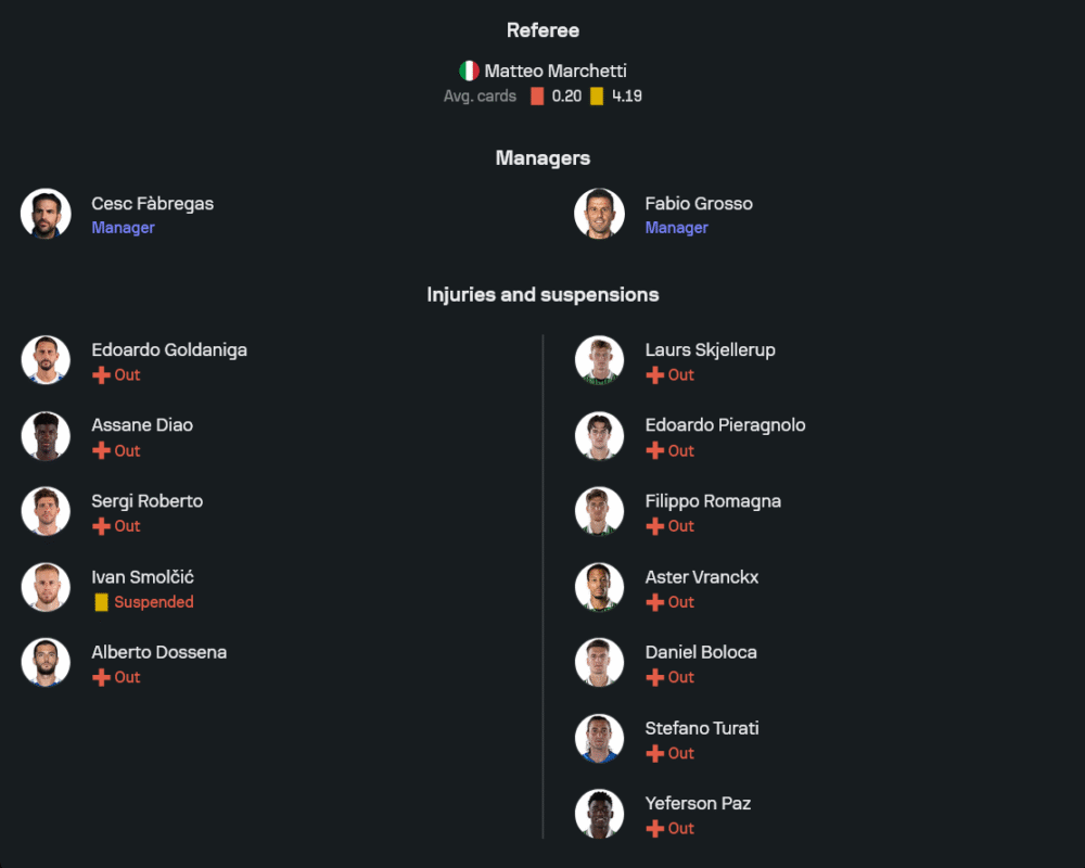 ฝั่งทีมเยือนของ ฟาบิโอ กรอสโซ่ แม้ฟอร์มในลีกช่วงหลังจะมีแกว่งบ้าง แต่ด้วยศักยภาพเกมรุกที่ยิงได้แทบทุกนัด ทำให้ไม่อาจมองข้ามพวกเขาได้เลย สภาพทีมยังขาดแข้งเจ็บชุดเดิมทั้ง เลาร์ส เชลเลอร์รุป, เอโดอาร์โด เปียรานโญโล, ฟิลิปโป โรมัญญ่า, อาสเตอร์ ฟร็องก์ซ์, ดาเนียล โบโลก้า, สเตฟาโน ตูราตี และ เยเฟร์ซอน ปาซ แต่ตัวหลักในแนวรุกและแดนกลางยังพร้อมลุยครบ
