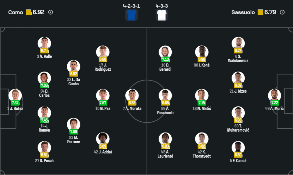 จากภาพไลน์อัพล่าสุด โคโม่ยึดระบบ 4-2-3-1 ผู้รักษาประตูเป็น ฌ็อง บูเตซ ที่ฟอร์มหนึบต่อเนื่อง แผงแบ็กโฟร์จากขวาไปซ้ายประกอบด้วย สเตฟาน พอช, จาโคโบ ราม่อน, ดิเอโก้ คาร์ลอส และ อเล็กซ์ บาเย่ สองมิดฟิลด์ตัวรับใช้ มักซิโม เปร์โรเน กับ ลูคัส ดา คุนญ่า คอยตัดเกมและเชื่อมบอลขึ้นหน้า สามตัวรุกด้านหลังหัวหอกมี เจย์เดน แอดได ยืนฝั่งขวา นิโก้ ปาซ ทำเกมตรงกลาง ส่วนเฆซุส โรดริเกซ ปักหลักฝั่งซ้าย พร้อมสนับสนุนหน้าเป้าอย่าง อัลบาโร่ โมราต้า ที่ยืนค้ำคอรอปิดบัญชีในกรอบเขตโทษ