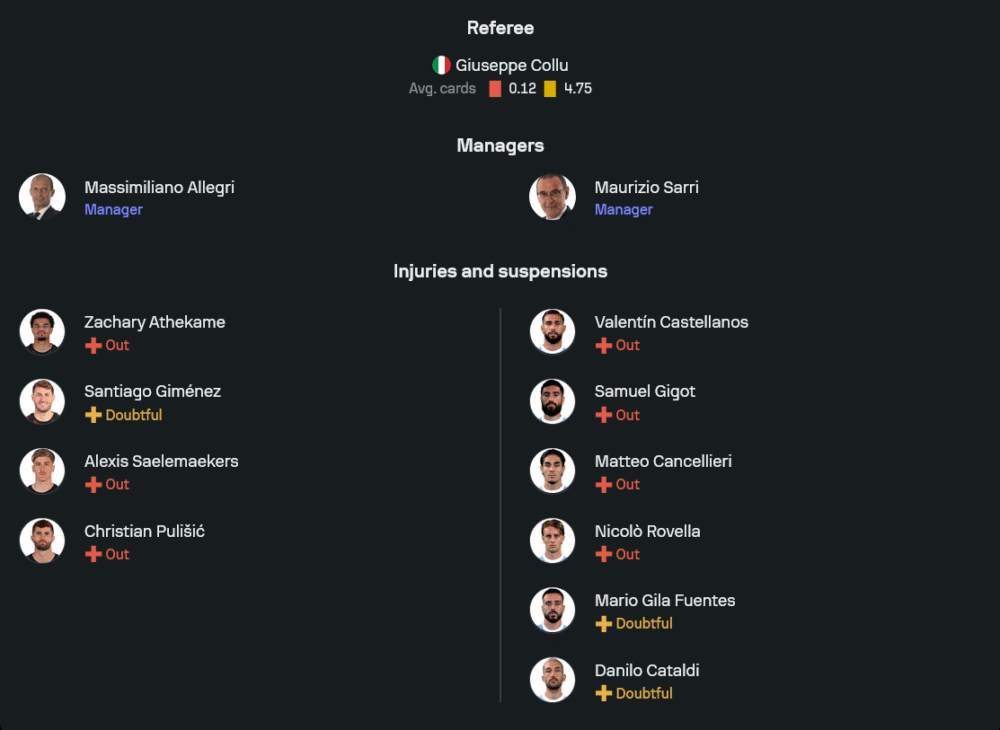 ซาร์รี่วางระบบ 4-3-3 ตามสไตล์ฟุตบอลไหลลื่นของตัวเอง ผู้รักษาประตูเป็น อีวาน โปรเวเดล แผงหลังสี่คนประกอบด้วย อดัม มารูซิช ทางขวา มาริโอ กีล่า จับคู่กับ อเลสซิโอ โรมานโญลี่ ในตำแหน่งเซ็นเตอร์ ส่วนแบ็กซ้ายเป็น ลูก้า เปลเลกรินี่ กลางสามตัวใช้ มัตเตโอ เกนดูซี่, ดานิโล คาตัลดี้ และ โตมา บาชิช คุมพื้นที่แดนกลาง หน้าสามวาง กุสตาฟ อิซัคเซ่น ทางขวา มัตเตีย ซัคคานญี่ ทางซ้าย และ บูลาย เดีย ยืนศูนย์หน้าตัวเป้า พร้อมสร้างความวุ่นวายให้แนวรับเจ้าถิ่นทุกจังหวะบุก