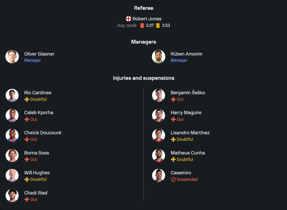ปัญหาสำคัญของยูไนเต็ดคืออาการบาดเจ็บและโทษแบน เบนจามิน เชสโก และ แฮร์รี แม็กไกวร์ ยังไม่พร้อม ส่วน มาร์ติเนซ กับ มัตเตอุส คุนญา ต้องลุ้นผ่านด่านทีมแพทย์ ขณะที่ คาเซมิโร เองก็มีประเด็นเรื่องโทษแบนค้างอยู่ ทำให้กุนซือต้องวางแผนเผื่อหลายชั้นก่อนเลือกสิบเอ็ดตัวจริงสุดท้าย