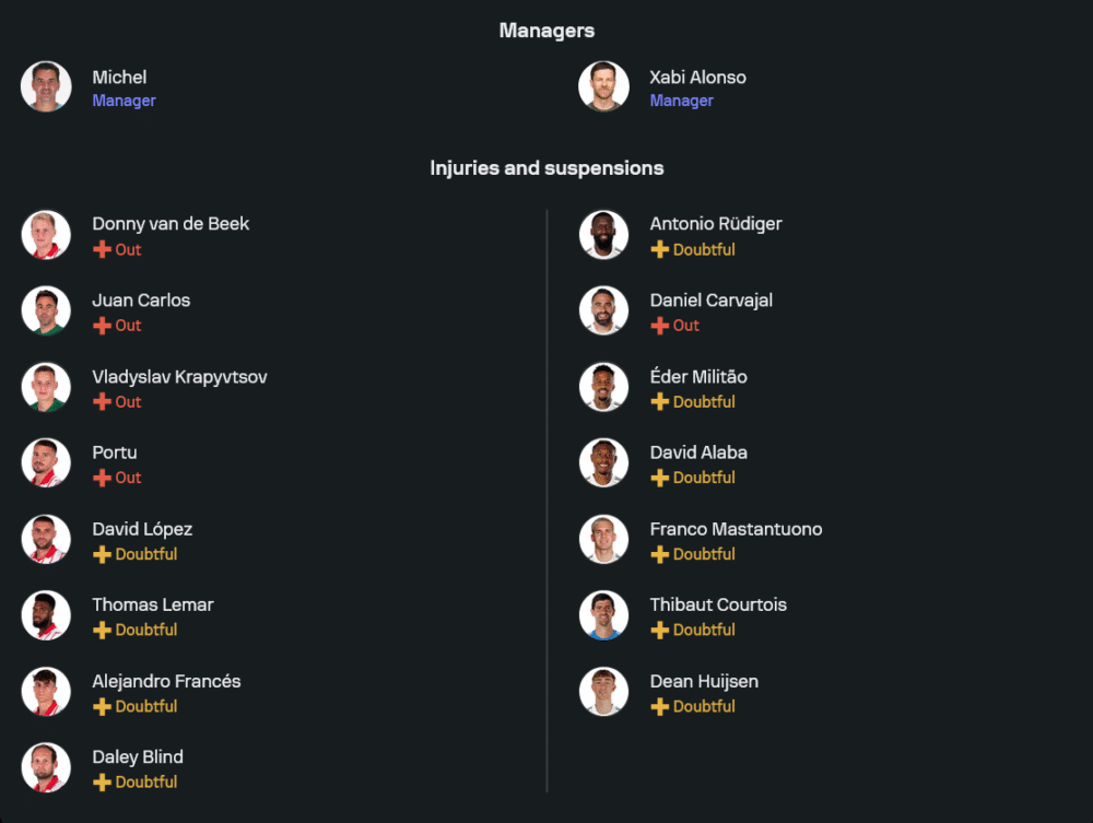 ปัญหาใหญ่ของเจ้าถิ่นคืออาการเจ็บสะสมยาวทั้ง คริสเตียน ปอร์ตู, ฆวน การ์ลอส, วลาดิสลาฟ คราปิฟตซอฟ รวมถึง ดอนนี ฟาน เดอ บีค ที่ยังไม่พร้อมทั้งหมด ขณะที่โทมัส เลอมาร์, ดาบิด โลเปซ, อเลฆานโดร ฟรานเซส และบลินด์เองก็อยู่ในกลุ่มต้องเช็กความฟิต ทำให้ตัวเลือกหมุนเวียนไม่มาก มิเชลอาจต้องใช้ชุดเดิมเกือบยกแผงจากเกมที่บุกเสมอเรอัล เบติส 1–1