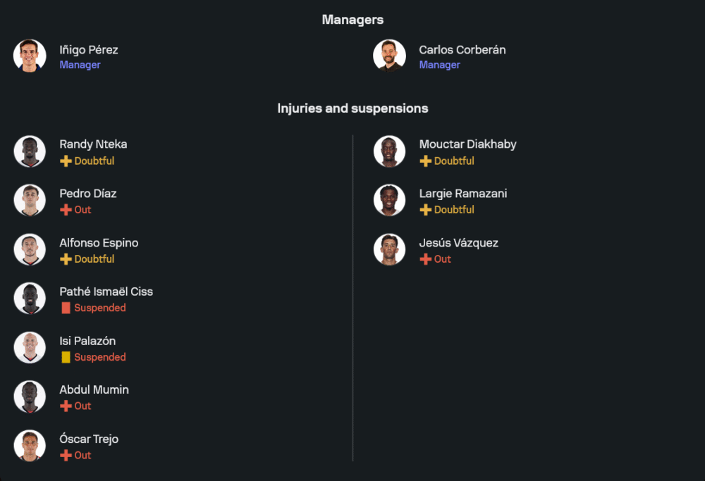 ทีมของโค้ช อีญีโก เปเรซ ยังต้องแก้โจทย์เรื่องสภาพทีมอย่างหนักก่อนเกมนี้ จากข้อมูลล่าสุดทั้งในรายงานและภาพไลน์อัพ มีแข้งตัวหลักหายไปหลายคน เริ่มจาก ปาเต้ ซิสส์ กับ อีซี ปาลาซอน โดนโทษแบนหมดสิทธิ์ช่วยทีม ขณะที่ อับดุล มูมิน, ดีเอโก เมนเดซ, เปโดร ดิอาซ และ ออสการ์ เตรโฆ เจ็บยาวต่อเนื่อง ด้าน แรนดี เอ็นเตกา, อีวาน บายญู และ อัลฟอนโซ เอสปิโน ต้องรอเช็กสภาพร่างกายอีกครั้ง