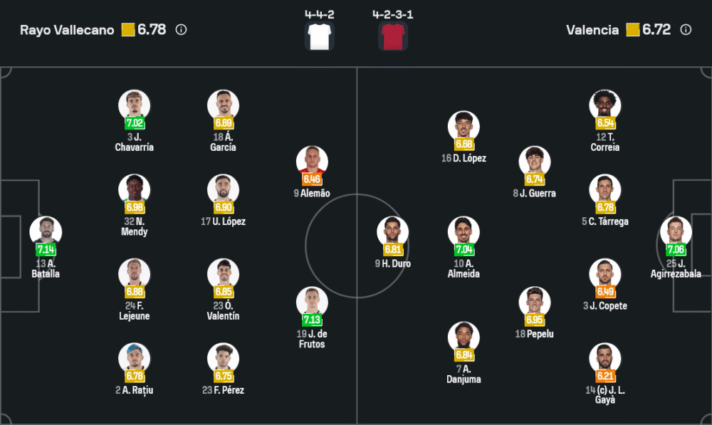 อย่างไรก็ตาม เปเรซยังคงยึดระบบ 4-4-2 ตามภาพจาก Sofascore ที่ส่ง บาตาย่า เฝ้าเสา แนวรับสี่คนจากขวาไปซ้ายคือ รัตตู, เลอเฌิน, เมนดี้ และ ชาบาร์เรีย แดนกลางใช้ เปเรซ ยืนคู่ บาเลนติน ขนาบข้างด้วย อูไน โลเปซ และ อัลบาโร การ์เซีย สองตัวริมเส้นที่วิ่งไล่บี้ตลอด 90 นาที ขณะที่คู่หน้าวางใจ ฆอร์เก เด ฟรูโตส เล่นร่วมกับ อาเลมาว หัวหอกจอมพลังที่จะคอยล่าประตูในกรอบเขตโทษคู่แข่ง