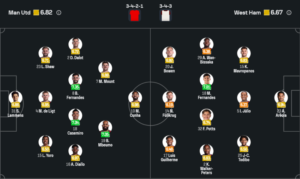 ภาพไลน์อัพจากข้อมูลล่าสุดชี้ให้เห็นว่า รูเบน อาโมริม เลือกจัดแผน 3-4-2-1 ใช้ เซนเน่ ลัมเมนส์ เฝ้าเสา กองหลังสามคนประกอบด้วย เลนี่ โยโร่, มัตไตย์ส เดอ ลิกต์ และ ลุค ชอว์ คอยยืนเป็นกำแพงก่อนถึงประตู แดนกลางวิงแบ็กขวาเป็น ดิโอโก้ ดาโล่ต์ ฝั่งซ้ายใช้ อาหมัด ดิยัลโล่ เติมเกมรุก-รับ ส่วนคู่กลางวาง คาเซมิโร่ ปักหลักร่วมกับ บรูโน่ แฟร์นานเดส ที่ถูกดันลงมาต่ำกว่าปกติเล็กน้อย