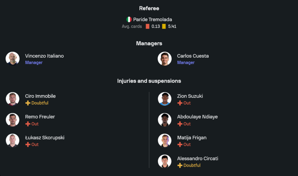 ลูกทีมของวินเชนโซ่ อิตาเลียโน่ เพิ่งสะดุดแพ้เครโมเนเซ่ในลีก เป็นการหยุดสถิติไร้พ่ายยาวนานเกินสิบแมตช์ แต่สิ่งนั้นยิ่งทำให้เกมถ้วยคืนนี้เปลี่ยนจากภารกิจธรรมดาเป็นงานล้างหน้าอย่างแท้จริง การจัดตัวจากภาพไลน์อัพล่าสุดในโซฟาสกอร์แสดงให้เห็นว่าโค้ชเตรียมโรเตชั่นแบบมีชั้นเชิงในระบบ 4-2-3-1 ผู้รักษาประตูใช้ เฟเดริโก้ ราวาเกลีย เฝ้าเสา แผงหลังสี่คนมี ยาโก้ มีรันดา ยืนแบ็กซ้าย, โนเอล คาซาเล กับ โตมมาโซ โปเบก้า ยืนคู่เซ็นเตอร์ และ นิโกล่า ซอร์เตอา ดูแลฝั่งขวา