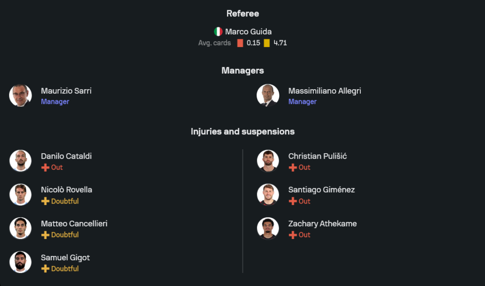 ลูกทีมของ เมาริซิโอ ซาร์รี่ กำลังอยู่ในช่วงฟอร์มแกว่ง แพ้ 2 จาก 3 เกมล่าสุดในลีก ความต่อเนื่องยังห่างจากคำว่ายักษ์ใหญ่ไปพอสมควร แถมยังมีปัญหาเรื่องสภาพทีมเมื่อแข้งแกนกลางหลายคนอย่าง ดานิโล่ คาตัลดี้, นิโคโล่ โรเวลล่า, มัตเตโอ กันเชลลีเยรี่ และ ซามูแอล ชิโกต์ ต้องลุ้นความฟิตหรือพักยาว ทำให้แผนการจัดทัพคืนนี้จำเป็นต้องโรเตชั่นบางตำแหน่ง
