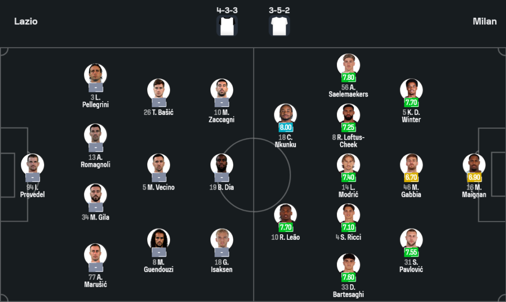อย่างไรก็ดี จุดที่ปีศาจแดงดำได้เปรียบคือการเคลื่อนที่ของคู่หน้าที่อันตรายมาก เลเอามักดึงตัวประกบหลุดออกไปทางซ้าย เปิดช่องให้เอ็นคุนคูวิ่งสอดเข้าเขตโทษ รับบอลทะลุช่องจากโมดริชหรือริชชี่ การที่ลาซิโอยังขาดเซ็นเตอร์ฮาล์ฟตัวเลือกหลายคนและต้องใช้งานคู่โรมานโญลี่–กีล่า ซึ่งยังไม่ได้ยืนด้วยกันบ่อยนัก อาจถูกทดสอบอย่างหนักกับการเคลื่อนที่ของแนวรุกมิลาน