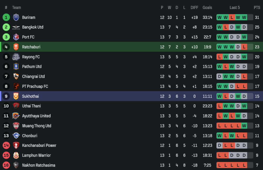 คืนวันศุกร์ที่ 5 ธันวาคม 2568 เวลา 19.00 น. สนามมิตรผล สเตเดียมจะลุกเป็นไฟเมื่อ ราชบุรี เอฟซี ทีมฟอร์มแรงอันดับหัวตาราง เปิดรังรับการมาเยือนของคู่แข่งจอมเหนียวอย่าง สุโขทัย เอฟซี ในเกมระดับหัวใจเต้นไม่ทันจังหวะของศึกฟุตบอล ไทยลีก ฤดูกาลนี้ เจ้าถิ่นลงเล่นไปแล้ว 10 นัด ชนะ 6 เสมอ 1 แพ้ 3 ยิงได้ 19 เสียเพียง 9 ประตู ลูกได้เสีย +10 แสดงให้เห็นถึงเกมรุกดุดันผสมกันอย่างลงตัวกับเกมรับที่รัดกุม ส่วน “ค้างคาวไฟ” ลงเตะเท่ากันแต่ผลงานยังขึ้นๆ ลงๆ ชนะ 2 เสมอ 6 แพ้ 2 ยิงได้ 10 เสีย 15 ลูกได้เสียติดลบ