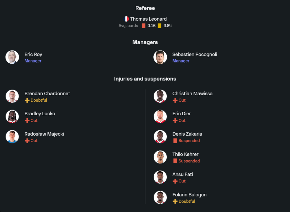 ลูกทีมของเอริก รอย ยังคงยึดระบบ 4-2-3-1 จากภาพไลน์อัพล่าสุดบน Sofascore ผู้รักษาประตูเป็น เกาติเยร์ คูเดร์ ที่โชว์ฟอร์มเหนียวเซฟสวยๆ หลายครั้ง แผงแบ็กโฟร์จากขวาไปซ้ายประกอบด้วย เคนนี ลาล่า, แบรนด็อง ชาร์ดอนเนต์, มาร์กอส ดิอาซ และ เลสลี บูร์โกต์ สองมิดฟิลด์ตัวคุมจังหวะใช้ ฮูโก้ มาญเน็ตติ จับคู่ เคย์ ดุมเบีย ส่วนแนวรุกสามตัวด้านหลังหน้าเป้าเป็น เดรมี่ กินโด ทางซ้าย โรแม็ง เดล กาสตีโย ยืนตรงกลาง และ ปาป้า มบูป โยกขึ้นไปทำเกมทางขวา