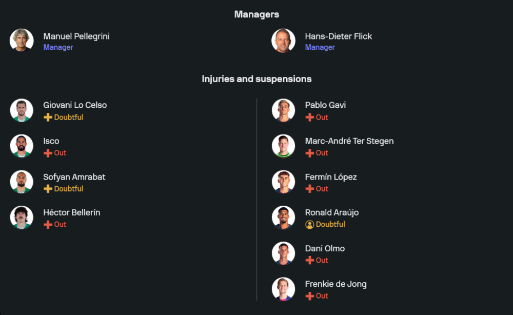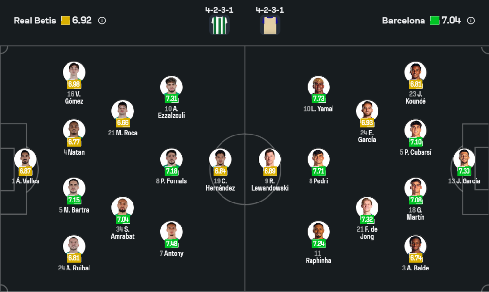จากภาพไลน์อัพล่าสุด เบติสจัดทัพในระบบ 4-2-3-1 ผู้รักษาประตูเป็น อัลบาโร่ บาเยส แผงแบ็กโฟร์มี ไอตอร์ รุยบัล ยืนขวา คู่เซ็นเตอร์ใช้ นาทัน กับ มาร์ก บาร์ตร้า ปิดท้ายฝั่งซ้ายด้วย วาเลนติน โกเมซ สองมิดฟิลด์ตัวรับคือ มาร์ก โรก้า จับคู่ เซอร์ดาน อัมราบัต คอยตัดเกมและเริ่มต้นการขึ้นบอล