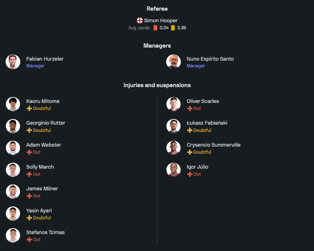 อย่างไรก็ตาม ไบรท์ตันยังต้องปวดหัวกับปัญหาตัวเจ็บหลายราย ทั้ง คาโอรุ มิโตมะ, จอร์จินิโอ้ รุตเตอร์, โซโลม่อน มาร์ช, เจมส์ มิลเนอร์, อดัม เว็บสเตอร์ และ สเตฟานอส ซิมาส ที่หมดสิทธิ์ลงช่วยทีม โดยมี ยาซิน อายารี่ อยู่ในกลุ่มเช็กฟิตด้วย แต่จากขุมกำลังที่เหลือในภาพรวมยังดูแน่นพอสำหรับการเปิดเกมรุกใส่คู่แข่ง