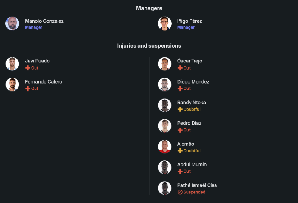 ลูกทีมของมาโนโล่ กอนซาเลซกำลังโชว์ฟอร์มในลีกได้อย่างมั่นใจ ชนะสองเกมติดเหนือเซบีย่าและเซลต้า บีโก้ แม้จะเพิ่งสะดุดร่วงโกปา เดล เรย์ ด้วยการแพ้ทีมจากดิวิชั่นล่างอย่างบาเลอาเรส 0-1 แต่ภาพรวมขุมกำลังยังถือว่าแน่นปึ้ก ปัญหาหลักมีเพียงอาการเจ็บเข่าของ ฆาบี ปูอาโด้ ตัวรุกคนสำคัญ รวมถึงการขาดหายของ เฟร์นานโด คาเลโร่ ตามรายงานเดิม แม้ในชุดไลน์อัพล่าสุดชื่อคาเลโร่จะถูกส่งลงยืนเซ็นเตอร์ แต่ก็ต้องรอดูการตัดสินใจขั้นสุดท้ายจากทีมแพทย์อีกครั้ง