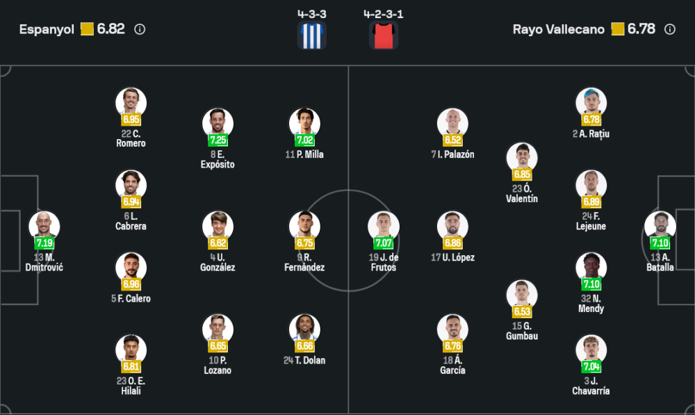 ฝั่งราโย่มาในระบบ 4-2-3-1 ผู้รักษาประตูเป็น สติอัน บาตาย่า แนวรับวาง อันดรี ราตยู, ฟลอร็อง เลอเฌิน, นูห์ ม็องดี้ และ ฆาบี ชาบาร์เรีย สองมิดฟิลด์ตัวรับใช้ เกร์าร์ด กุมบาว กับ น็อมปาลีส์ เมนดี้ คอยตัดเกม สามตัวรุกมี อัลบาโร่ การ์เซีย, ออสการ์ บาเลนติน และ ฮอร์เก้ เด ฟรุตอส ปั้นเกมอยู่ด้านหลัง อูไน โลเปซ ที่รับบทศูนย์หน้าตัวเป้าในค่ำคืนนี้