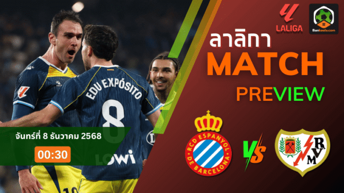 คืนวันจันทร์ที่ 8 ธันวาคม 2568 เวลา 00.30 น. แฟนบอลสเปนต้องไม่พลาดเมื่อศึก ลาลีกา คู่มันส์ประจำสัปดาห์ระเบิดขึ้นที่อาร์ซีดีอี สเตเดี้ยม เจ้าถิ่น เอสปันญ่อล เปิดบ้านรับการมาเยือนของทีมจอมบู๊จากมาดริดอย่าง ราโย่ บาเยกาโน่ เกมนี้สถานการณ์บนตารางถือว่าดุเดือด เจ้าบ้านรั้งอันดับหกมี 24 แต้มจาก 14 นัด ลุ้นเบียดกลุ่มโควตายุโรปเต็มตัว ส่วนทีมเยือนอยู่อันดับเก้า มี 17 คะแนน ต้องการชัยชนะเพื่อลดช่องว่างให้แคบลงไปอีก ราคาหน้าเสื่อเปิดให้เอสปันญ่อลต่อเบาๆ ในระดับครึ่งควบลูก บอกชัดว่ากลิ่นเกมสูสีมาเต็ม ใครไล่เช็กโปรแกรมจากหน้า ตารางบอลวันนี้ จะเห็นคู่นี้ถูกปักหมุดว่าเป็นหนึ่งในเกมที่ห้ามหลับห้ามกะพริบตา