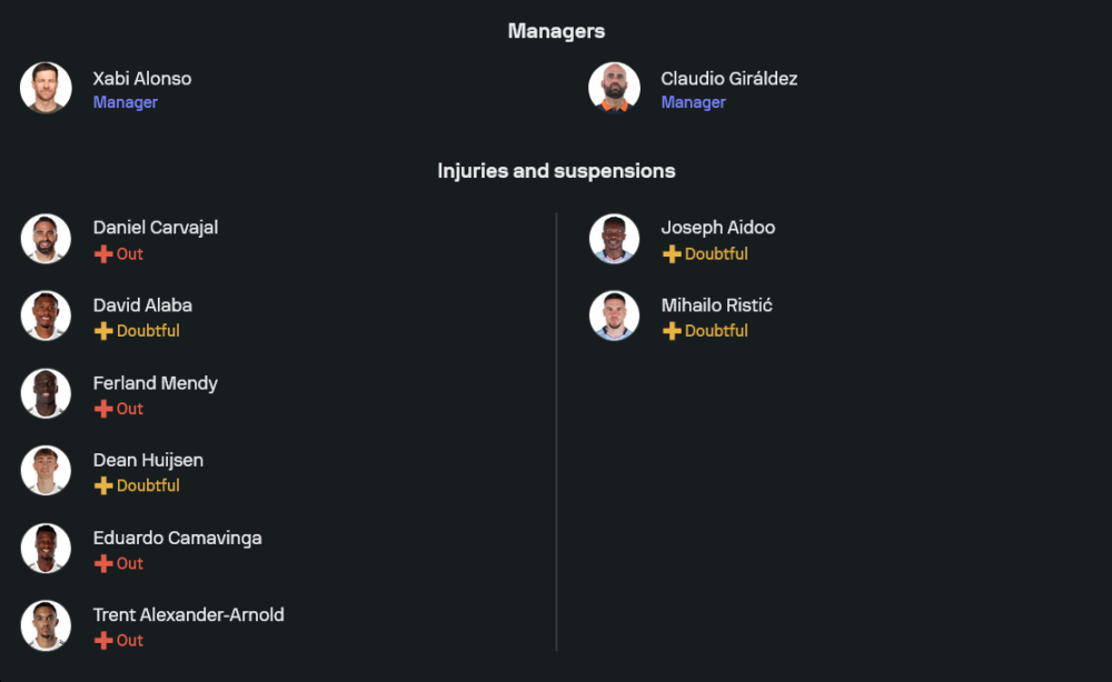 ลูกทีมของ ชาบี อลอนโซ่ เพิ่งคืนฟอร์มดุด้วยการบุกบอมบ์แอธเลติก บิลเบา 3-0 หลังจากก่อนหน้านั้นสะดุดเสมอในลีกสามเกมรวด ถือเป็นการส่งสัญญาณว่าพร้อมกลับมาล่าแชมป์อย่างเต็มตัวอีกครั้ง แม้สภาพทีมจะมีปัญหาเล็กน้อยจากตัวเจ็บหลายราย ทั้ง ดานี่ การ์บาฆาล, แฟร์กล็องด์ เมนดี้, เอ็ดวาร์โด้ กามาวิงก้า และ เทรนต์ อเล็กซานเดอร์–อาร์โนลด์ รวมถึงต้องเช็กความฟิตของ ดีน ฮอยส์เซ่น กับ ดาวิด อลาบา แต่ด้วยขุมกำลังที่ลึกและกว้างยังทำให้แนวทางการเล่นไม่สะดุด