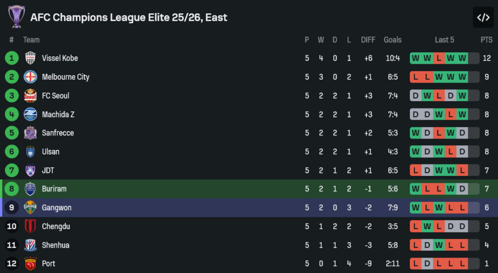 หากมองเฉพาะ 5 เกมหลังในทุกรายการ ปราสาทสายฟ้ากำลังอยู่ในช่วงมั่นใจสุดขีด ชนะ 3 เสมอ 2 ยังไม่แพ้ใคร ยิงรวม 11 ประตู เสียเพียง 2 ลูก ตัวเลขบ่งบอกชัดว่าทั้งเกมรุกและเกมรับทำงานสอดประสานกันอย่างดี เกมในบ้านยิ่งน่าเกรงขาม เมื่อเก็บชัยได้ 2 จาก 3 นัด ยิง 6 เสีย 2 พร้อมสถิติในถ้วยใหญ่เอเชียฤดูกาลนี้ 10 นัด ชนะ 4 เสมอ 3 แพ้ 3 ประตูได้เสีย +4 อยู่ในกลุ่มลุ้นพื้นที่บนของตาราง บุรีรัมย์มักเปิดฉากบุกเร็วและยิงประตูสำคัญได้ในช่วงราวนาทีที่ 45 ตามสถิติเวลาเฉลี่ยในการทำประตูในรังช้างอารีนา