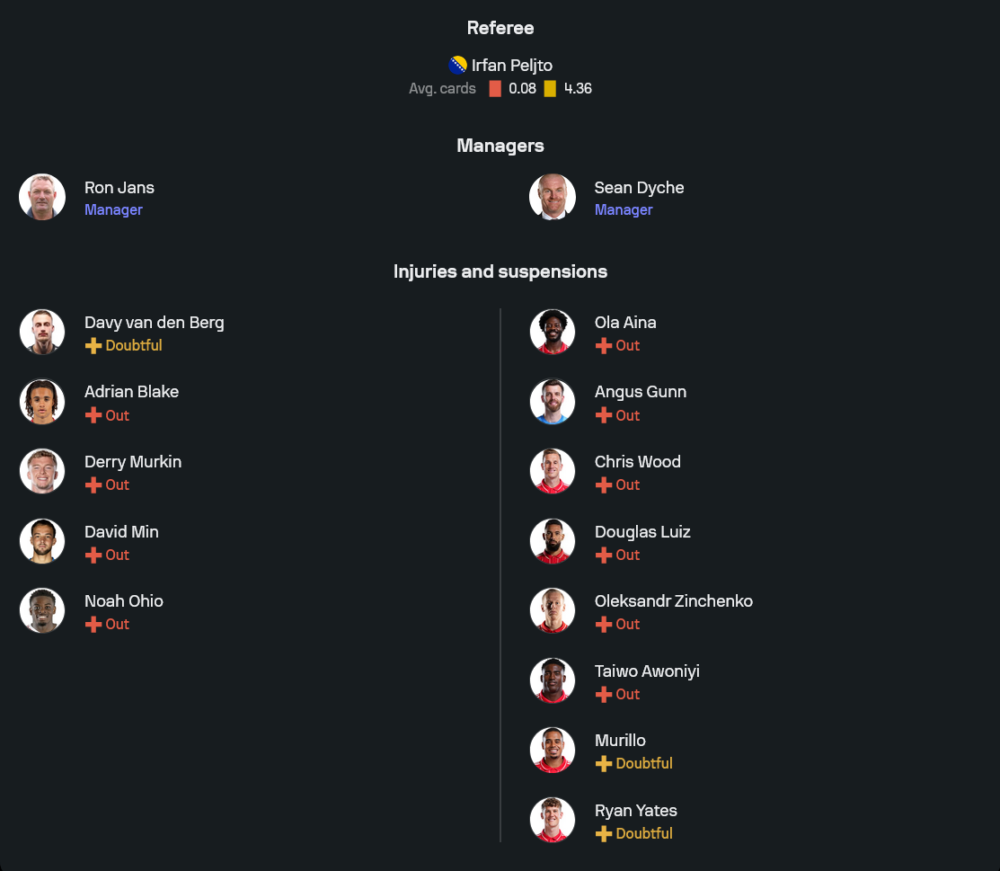 ฝั่งทีมเยือนของกุนซือ ฌอน ไดช์ เดินทางมาฮอลแลนด์พร้อมรายชื่อผู้เล่นเดี้ยงยาวเป็นหางว่าว ไล่ตั้งแต่ โอล่า ไอน่า, ดั๊กลาส ลุยซ์, คริส วู้ด, ไตโว่ อาโวนิยี่, อังกัส กันน์ รวมถึงมิดฟิลด์พลังใจอย่าง ไรอัน เยตส์ ที่เพิ่งเจ็บเพิ่มสดๆ ทำให้ต้องปรับหมากพอสมควร แต่ด้วยขุมกำลังที่ลึกและประสบการณ์ระดับพรีเมียร์ลีกยังพอหมุนเวียนได้สบาย