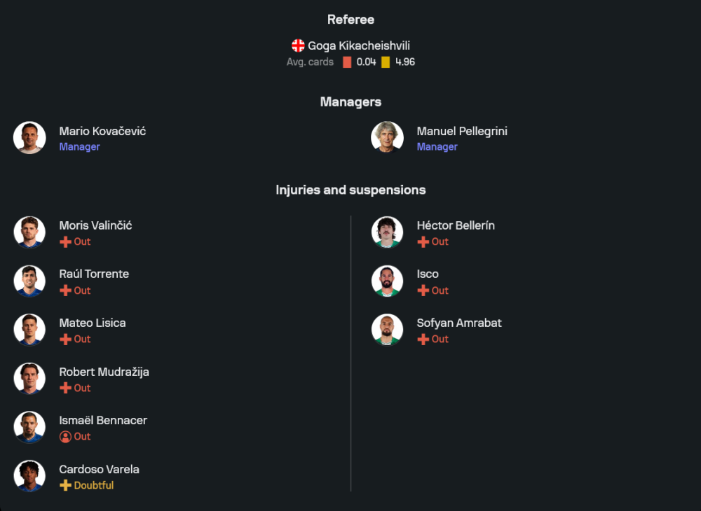 ฝั่งทีมเยือนของกุนซือมากประสบการณ์ มานูเอล เปเยกรินี เดินทางมาพร้อมข่าวร้ายอยู่บ้างเมื่อจะขาด เฮกตอร์ เบเยริน, อิสโก้ และ โซฟียาน อัมราบัต ที่ถูกอาการบาดเจ็บเล่นงาน แต่โครงหลักชุดใหญ่ยังอยู่กันครบ ทำให้ภาพรวมขุมกำลังยังดูแน่นและมีตัวเลือกให้หมุนเวียนได้