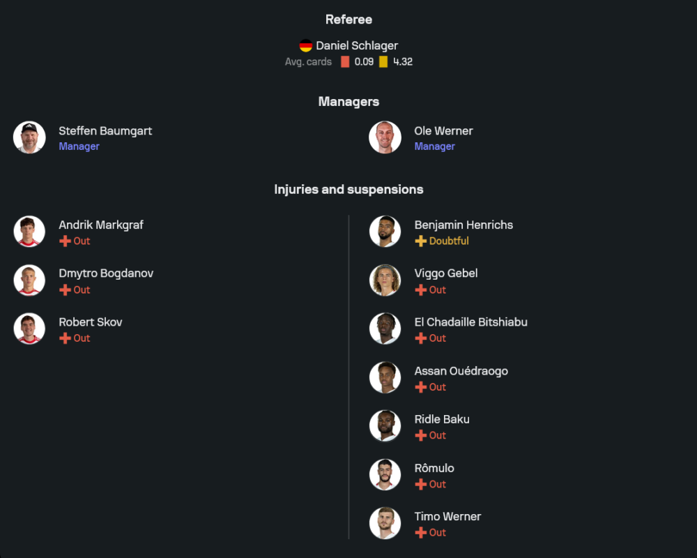 แดนกลางสามตัวใช้ ซาแวร์ ชลาเกอร์ ร่วมกับ นิโคลัส ไซวัลด์ และ คริสตอฟ ฮาร์เดอร์ ที่พร้อมสอดขึ้นมายิงเองเมื่อมีช่อง ด้านแนวรุกสามประสานจัดหนักด้วย ยาน ดิโอม็องเด้ ดาวยิงที่ฟอร์มร้อนแรง ยิงประตูต่อเนื่อง, โยฮัน บากาโยโก้ ตัวเลี้ยงลากจี้ริมเส้น และ คริสตอฟ บอมการ์ตเนอร์ ที่พร้อมสอดเข้ามาทำสกอร์จากแถวสอง แม้จะไม่มีชื่อของ ริดเล บากู, เอล ชาดาย บิตชาบู, อัสซัน อูเอดราโอโก้, โรมูโล่ และ ทีโม แวร์เนอร์ ที่ยังบาดเจ็บ รวมถึง เบนยามิน เฮนริคส์ ที่ต้องเช็กฟิต แต่ไลป์ซิกยังมีตัวสอดแทรกให้หมุนเวียนได้แบบไม่สะดุด