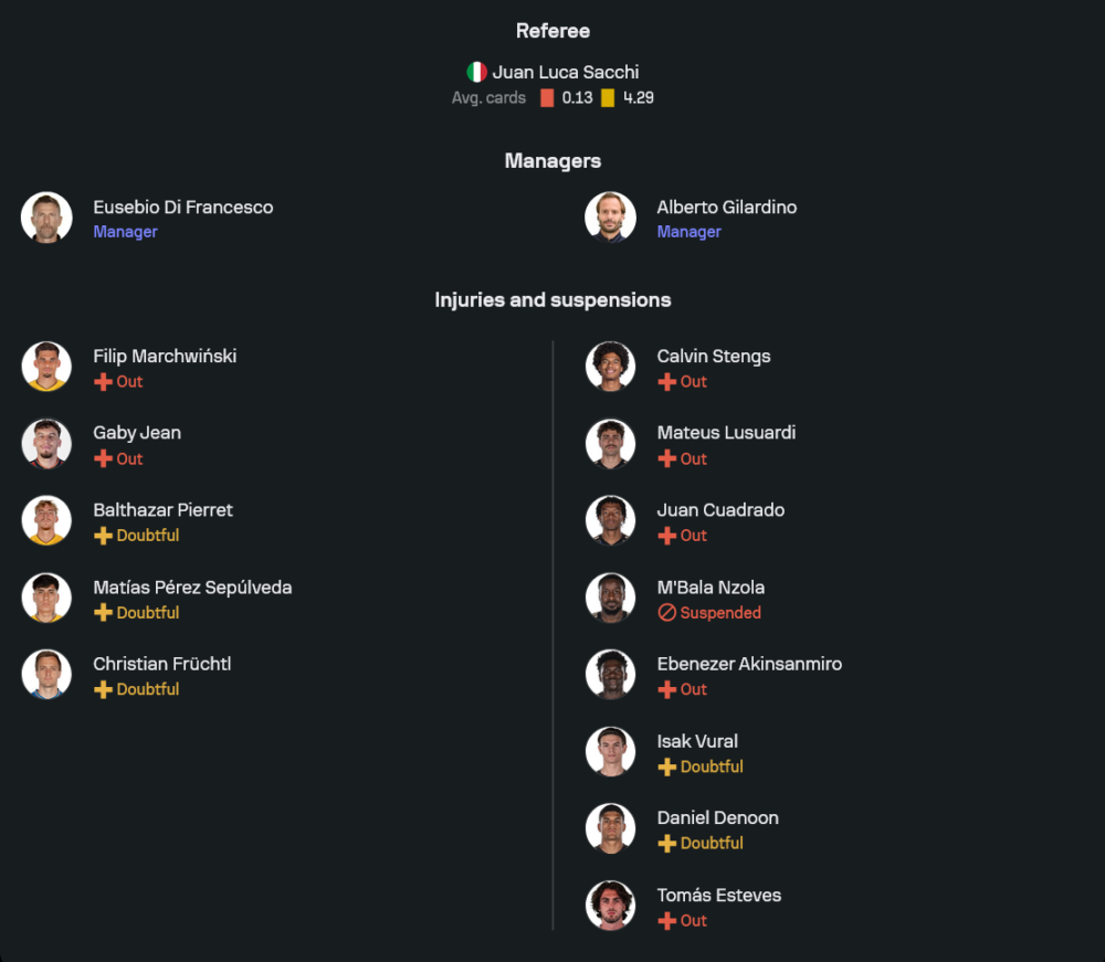 ลูกทีมของ ยูเซบิโอ ดิ ฟรานเชสโก ต้องพยายามเรียกความมั่นใจกลับมาให้เร็วที่สุด หลังผลงานเหย้าในลีก 7 นัด ชนะเพียงครั้งเดียว ระบบที่คาดว่าจะใช้ยังเป็น 4-2-3-1 ตามภาพไลน์อัพจาก Sofascore วลาดิมิโร ฟัลโกเน่ ยืนเฝ้าเสา แผงหลังสี่คนมี ดานิโล วีก้า ทางขวา คู่เซ็นเตอร์เป็น คิอาลอนดา กาสปาร์ ประสานงานกับ ติอาโก้ กาเบรียล ขณะที่ฝั่งซ้ายเป็น อันโตนิโน กัลโล