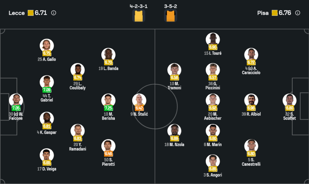 ด้านปิซ่า แม้ขาดหน้าเป้าอย่างเอ็นโซล่า แต่ระบบ 3-5-2 ทำให้พวกเขายังเหนียวแน่นในแดนกลาง สามารถตั้งโซนรับต่ำแล้วดันมิดฟิลด์อย่าง เอบีเชอร์ หรือ มาริน เติมขึ้นมาช่วยเมสเตอร์กับตราโมนี่ในจังหวะสวนกลับ จุดที่เลชเช่ต้องระวังคือการเสียบอลง่ายบริเวณกลางสนาม เพราะปิซ่ามักสวนกลับด้วยบอลยาวออกริมเส้นให้วิงแบ็กเติมขึ้นมาเปิดทันที