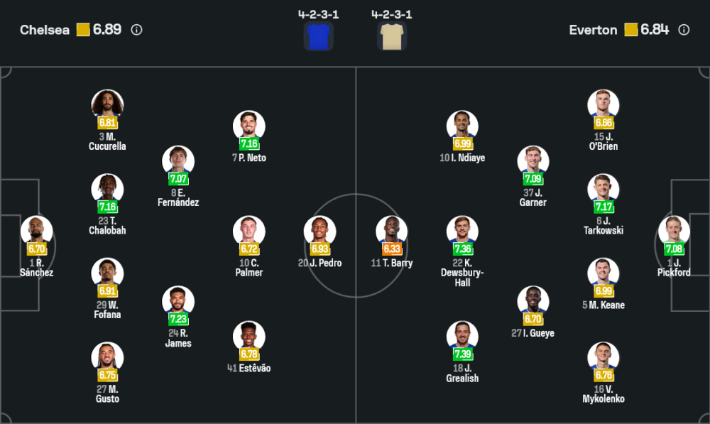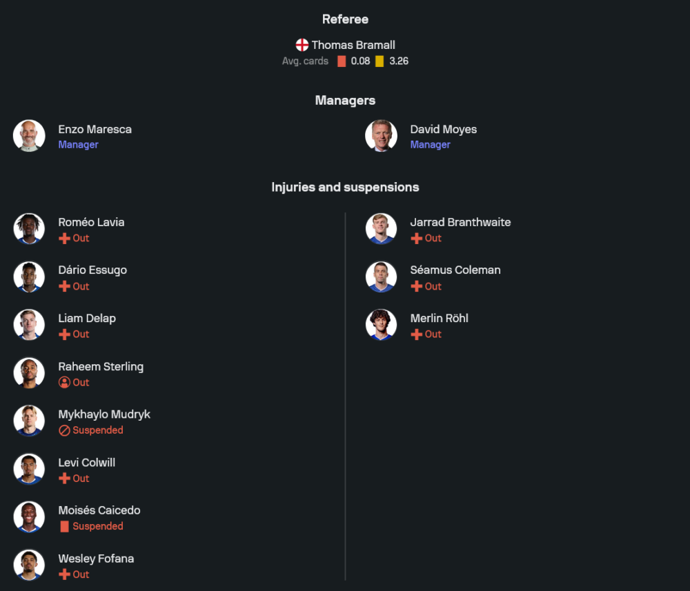 ฝั่งเอฟเวอร์ตันของ เดวิด มอยส์ ได้ข่าวดีจากต้นฉบับคือ อิดริสซ่า กูเอเย่ และ ทิม อิโรจีบูนัม พ้นโทษแบนกลับมาเป็นตัวเลือกได้อีกครั้ง แต่ก็ยังมีตัวเจ็บที่ต้องทำใจ ได้แก่ จาร์แรด แบรนธ์เวต, ซีมุส โคลแมน และ เมอร์ลิน โรห์ล (ซึ่งรายชื่อทั้งหมดปรากฏในภาพแนบว่าไม่พร้อม) รูปแบบการเล่นยังเน้น 4-2-3-1 วาง เธียร์โน่ แบร์รี่ ยืนค้ำหน้า และให้ การ์ลอส อัลการาซ คอยทำเกมรุกด้านหลัง โครงนี้จุดเด่นคือเล่นเป็นบล็อกแน่นแล้วรอจังหวะสวน ถ้าเชลซีเผลอเสียบอลในโซนอันตราย มีสิทธิ์โดนลงโทษทันที