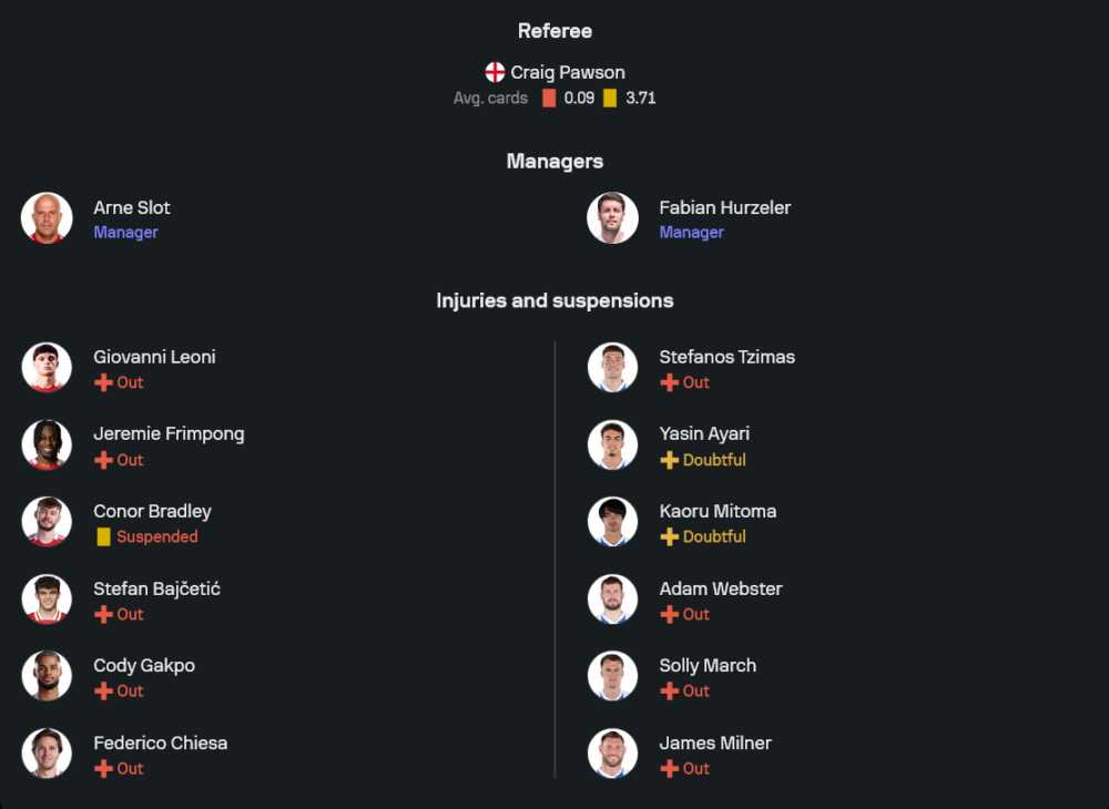 ฝั่งหงส์แดงของกุนซือ อาร์เน่อ สล็อต มีการบ้านหนักเรื่องตัวผู้เล่น ตามต้นฉบับระบุว่าขาด คอเนอร์ แบร็ดลี่ย์ ที่ติดโทษแบนจากใบเหลืองสะสม รวมถึงกลุ่มตัวเจ็บอย่าง โจวานนี่ เลโอนี่, เฌเรมี่ ฟริมปง, สเตฟาน บายเซติช และ โคดี้ กั๊คโป ขณะที่ เฟเดริโก้ คิเอซ่า ก็ไม่พร้อมใช้งานเช่นกัน ซึ่งทั้งหมดสะท้อนว่าขุมกำลังไม่ได้เต็มร้อยในบางตำแหน่ง