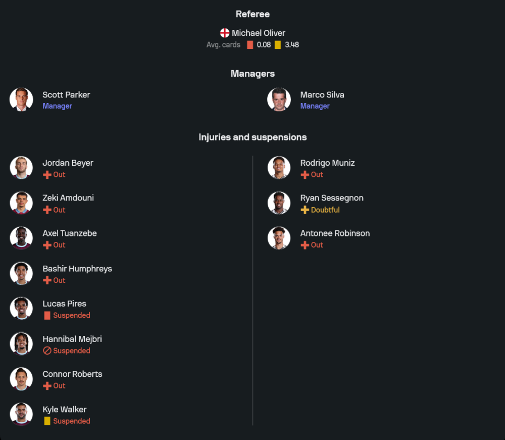 ฟูแล่มของ มาร์โก้ ซิลวา ไม่มีรายงานตัวเจ็บหรือติดโทษแบนเพิ่มจากต้นฉบับ นอกเหนือจากสามคนเดิมที่ไม่พร้อมคือ โรดริโก้ มูนิซ, ไรอัน เซสเซญง และ แอนโตนี่ โรบินสัน (ภาพแนบย้ำว่ามีรายหนึ่งสถานะต้องลุ้นความฟิต) ภาพรวมถือว่า “สภาพทีมยังพอจัดตัวได้เป็นทรง” มากกว่าเจ้าบ้านพอสมควร